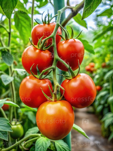 Зрелые красные помидоры растут на виноградной лозе в теплице