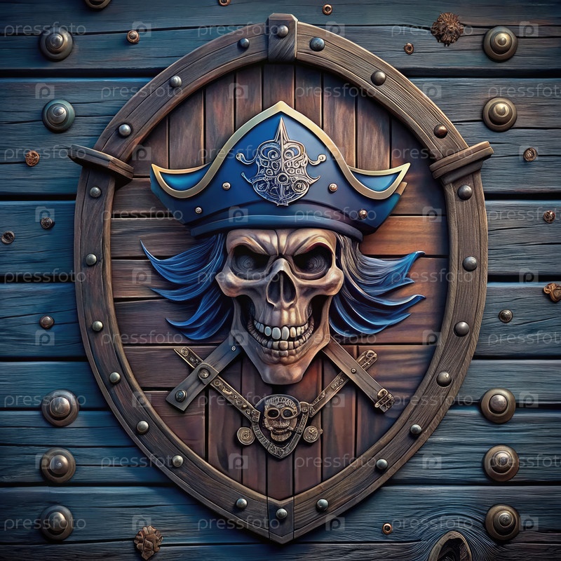 Пиратский череп, вырезанный на деревянном щите. генеративная ИИ