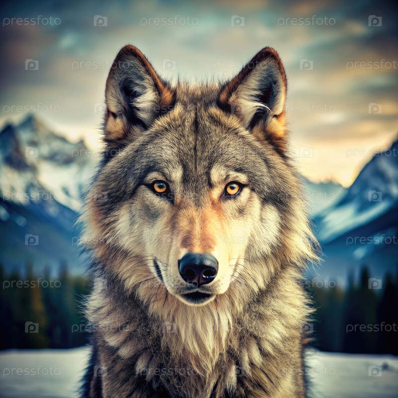 Vintage Yellowstone Park Wolf Portrait Against Snowy Mountains. генерирующий ИИ