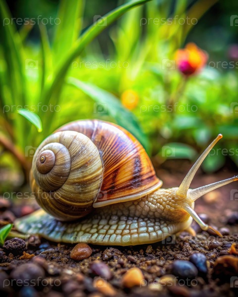 Садовый улитка ползает по почве с зеленой травой и цветами на заднем плане
