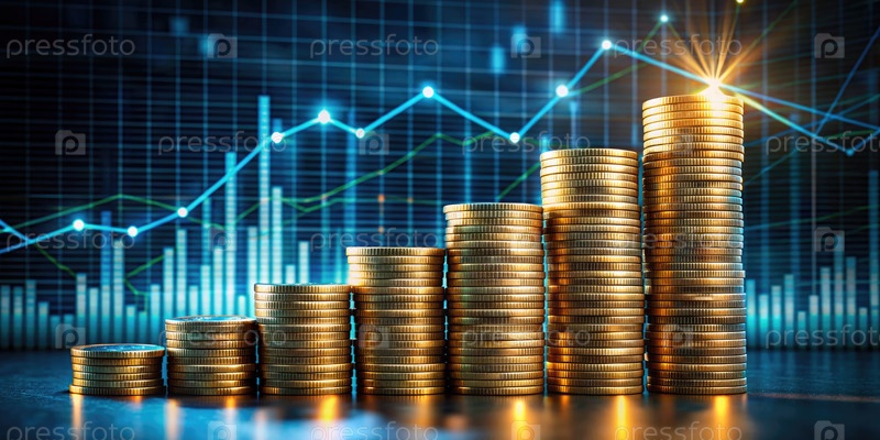 Стол золотых монет поднимается против диаграммы фондового рынка