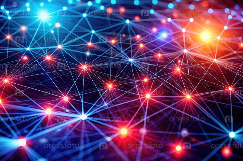 Абстрактная сеть взаимосвязанных узлов с яркими красными и синими огнями