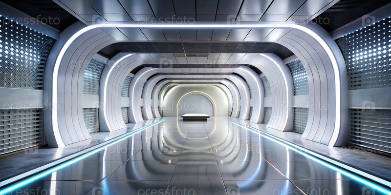 Футуристический белый коридор с освещенными напольными и потолочными огнями
