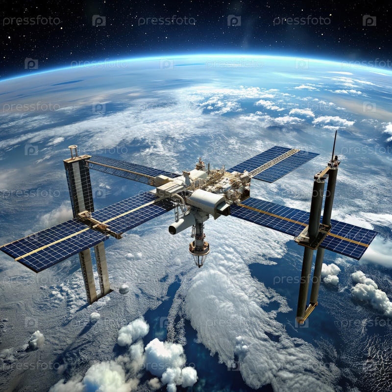Международная космическая станция вращается вокруг Земли с использованием солнечных панелей. генеративный ИИ