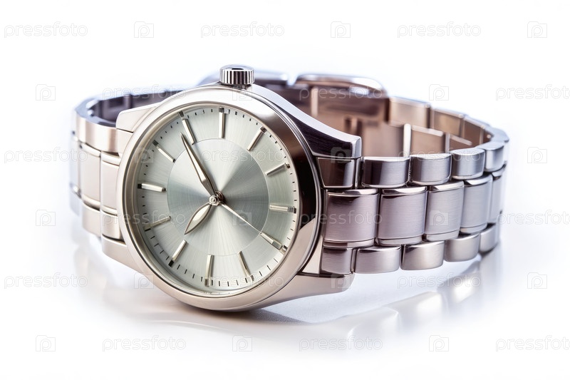 Серебряные наручные часы из нержавеющей стали с серебряным циферблатом и металлической лентой, изолированными на белом фоне