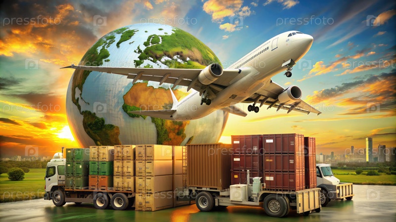 Самолет взлетает над земным шаром с грузовыми грузовиками на закате