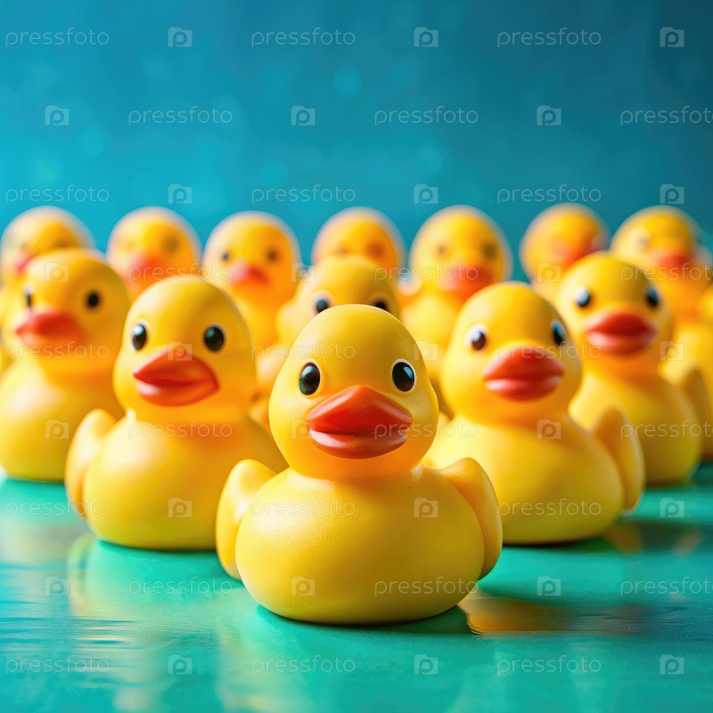 Ряд желтых резиновых щенков на бирюзовом фоне