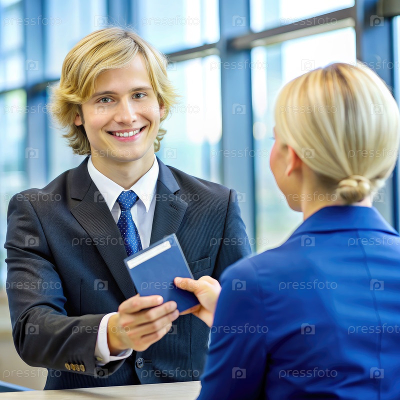 Сотрудник Visa Center передает паспорт клиенту в офисе