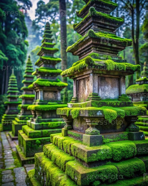 Мох, покрытый древней азиатской каменной пагодой Структуры в пышно-зеленом лесостепном ландшафте