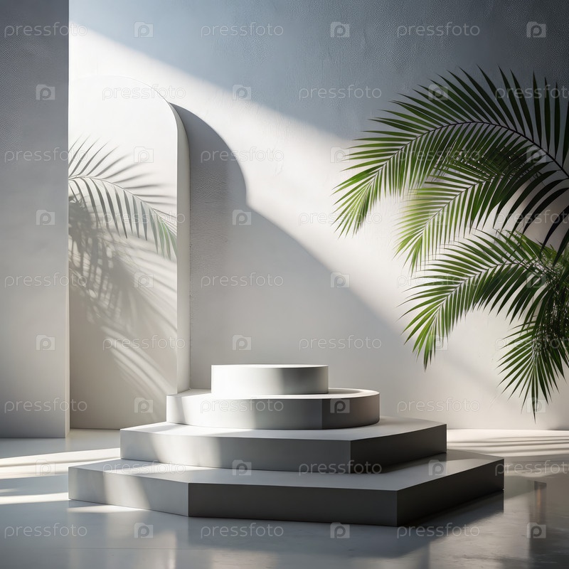 Белый платформенный дисплей с тенями пальмовых деревьев и солнечным светом. генеративная ИИ