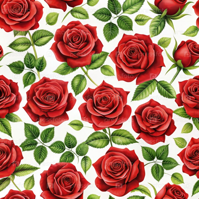 Красные розы и зеленые листья на белом фоне
