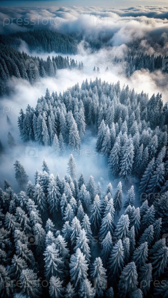 Вид с воздуха на снежный лес в зимнем тумане