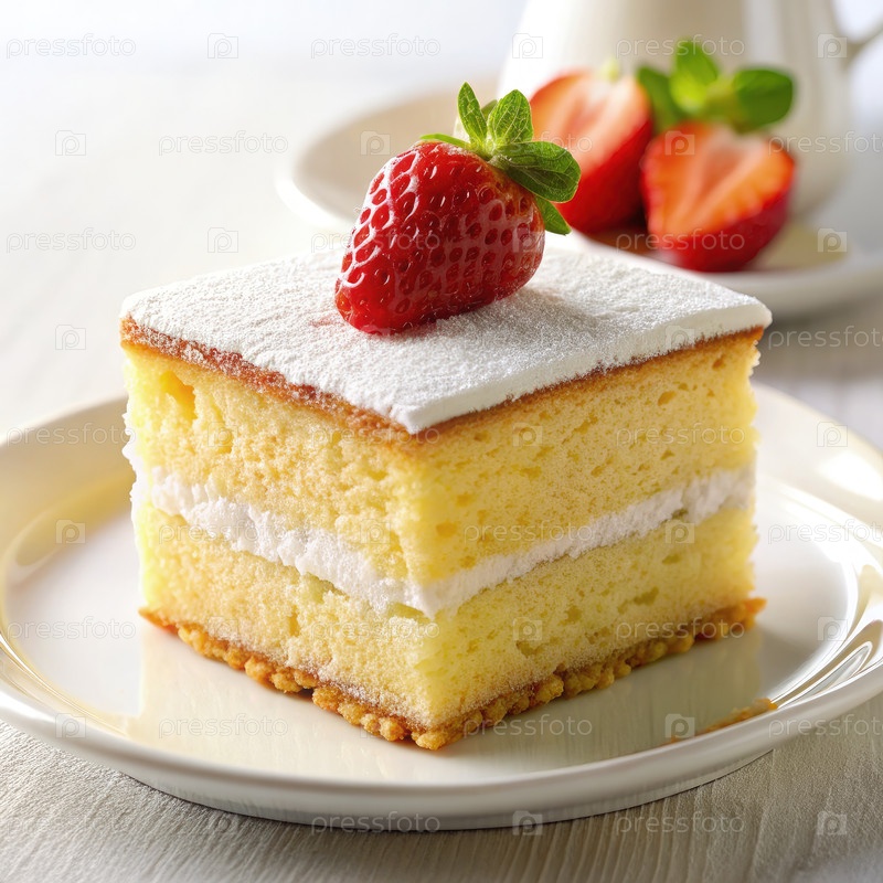 Кусок губчатого торта с отбивным сливком и клубничной начинкой на белой тарелке