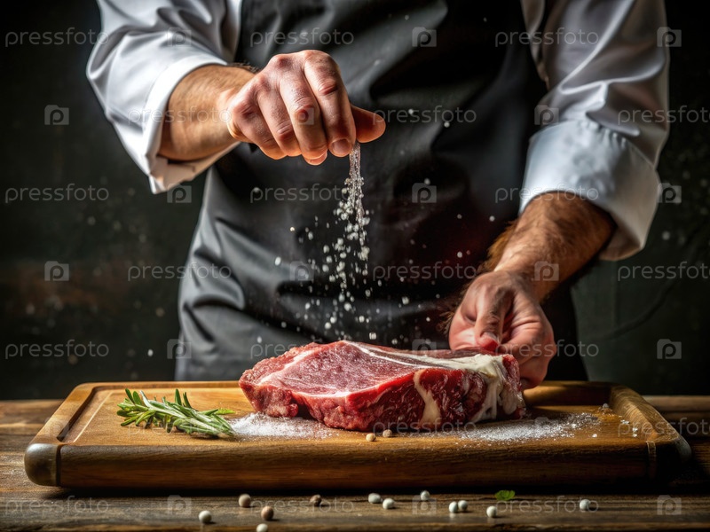 Шеф приправляет сырые стейки солью на деревянной режущей доске