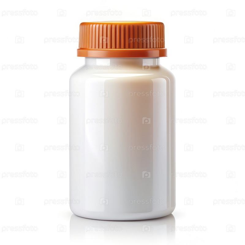 Белая пластиковая бутылка с оранжевой крышкой на белом фоне