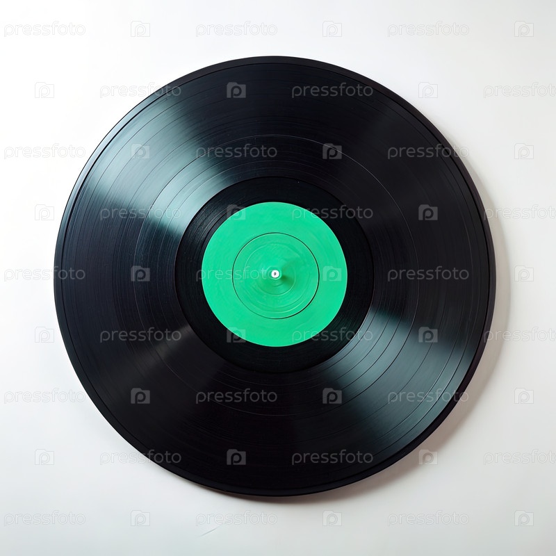 Одиночная черная виниловая запись с зеленым ярлыком на белом фоне