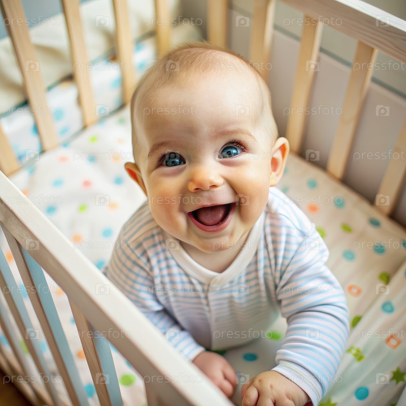 Счастливый ребенок в колыбели улыбается на камеру