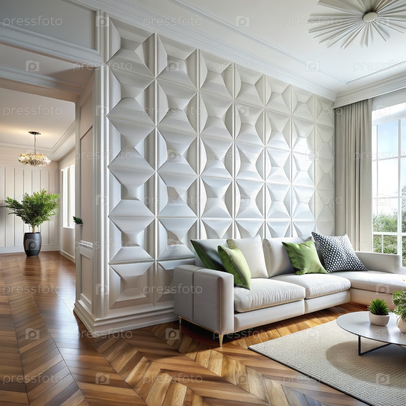 Геометрические стеновые панели в современной гостиной. генеративный белый AI