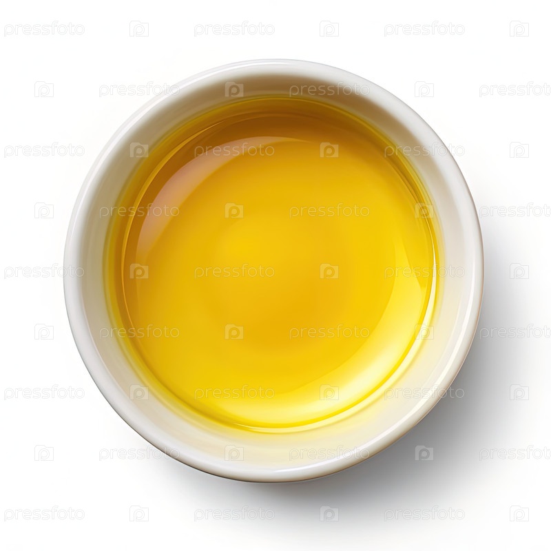 Сверхглавное изображение желтого кулинарного масла в белой чашке