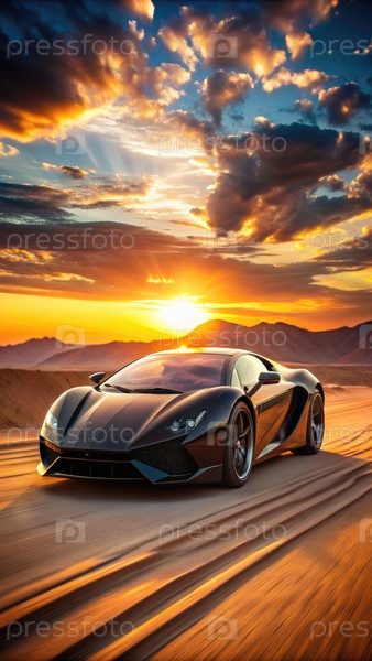 Черный роскошный спортивный автомобиль едет через пустыню на закате