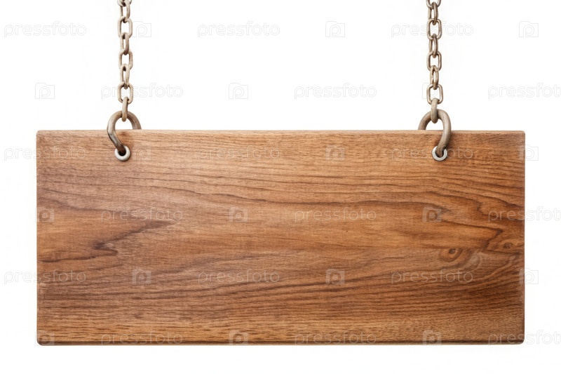Пустой деревянный знак, висящий на цепях на белом фоне