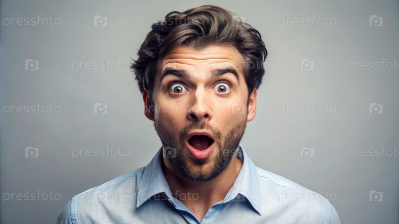 Удивленный молодой человек с открытым ртом и широкими глазами на сером фоне