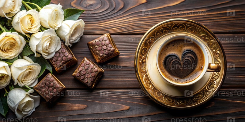 Главный вид темнозолотой кофейной чашки с дизайном сердца на деревянном столе
