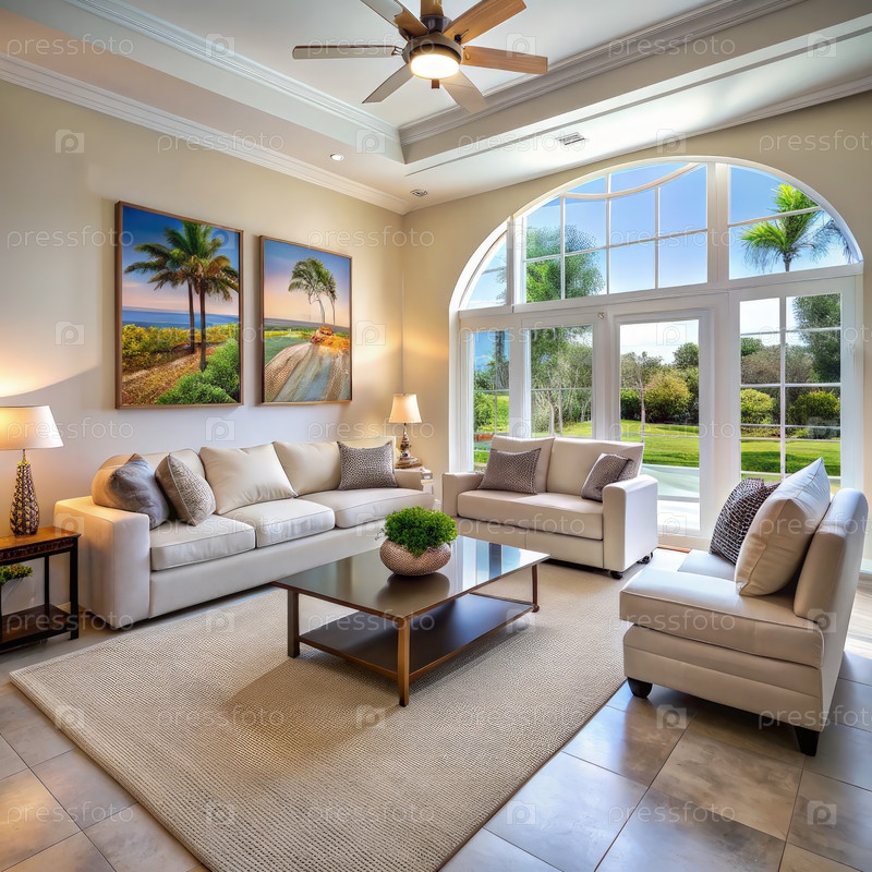 Просторная гостиная с белыми стенами и тропическими произведениями искусства