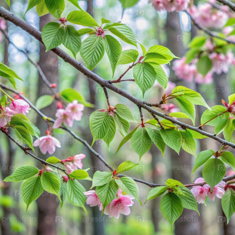 Близкий взгляд на нежные розовые цветы сакуры и пышные зеленые листья на ветке в лесу