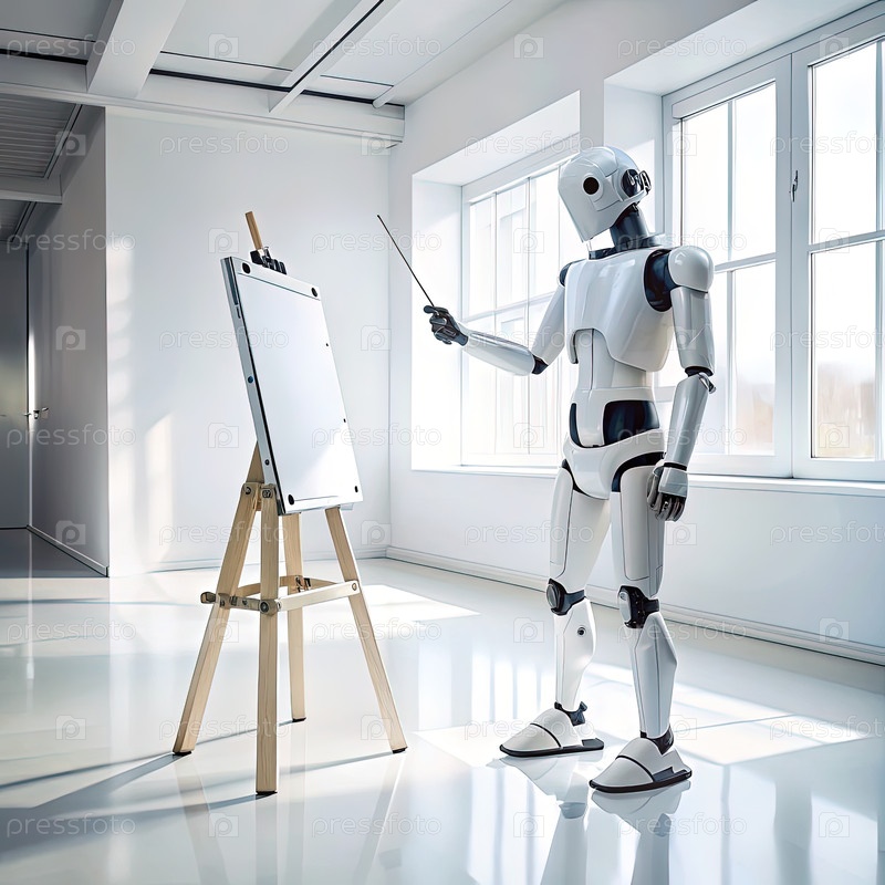 Белый робот представляет перед пустым холстом в современном офисе