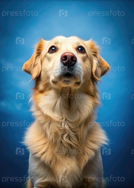 Золотой ретривер смотрит вверх на синий фон
