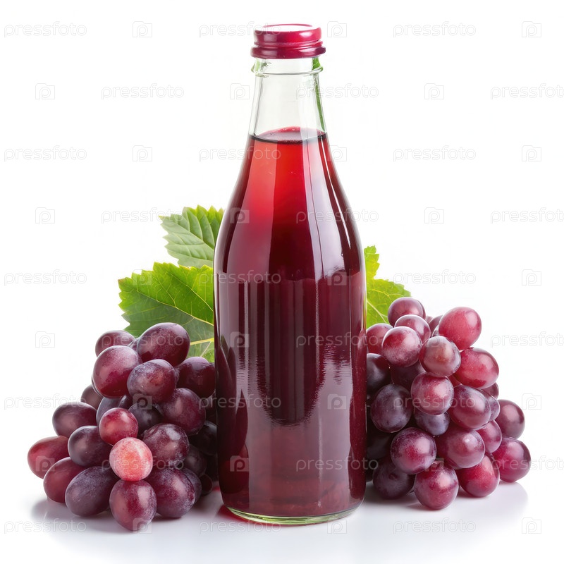 Бутылка сока из красного винограда с виноградом и листьями на белом фоне