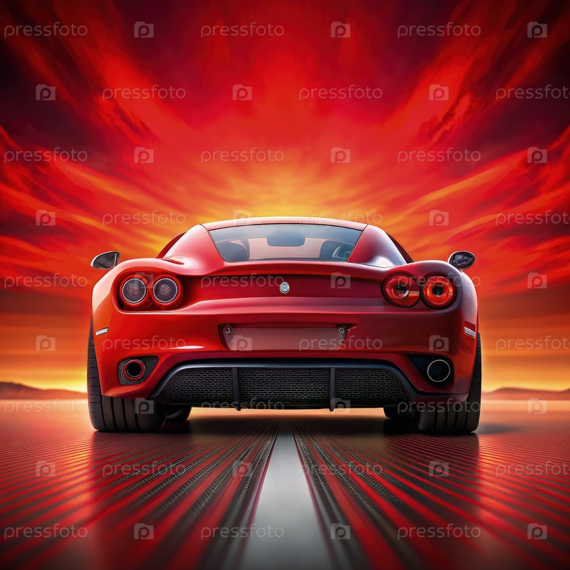 Спортивный автомобиль, едущий перед красным закатом