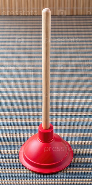 Красный водопровод с деревянной ручкой на полосатом ковре. генеративная AI