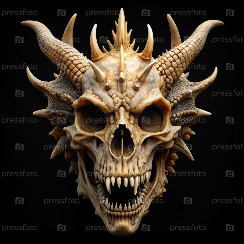 Вид над головой на череп дракона с клыками и шипами