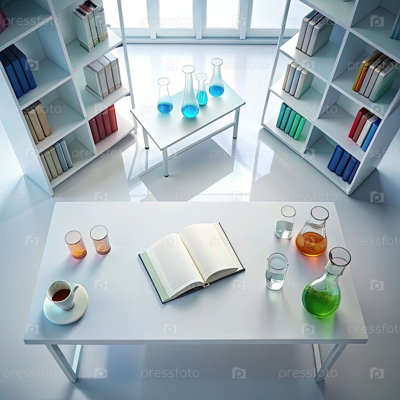 Вид сверху полупустого лабораторного стола с книгами, стеклянной посудой и открытой книгой