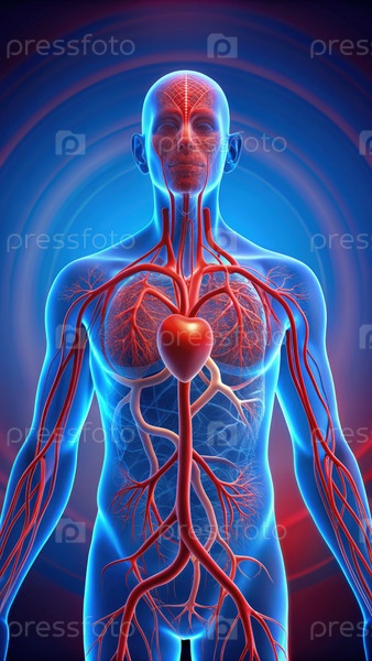 Прозрачная человеческая фигура, показывающая здоровые кровеносные сосуды и красное сердце