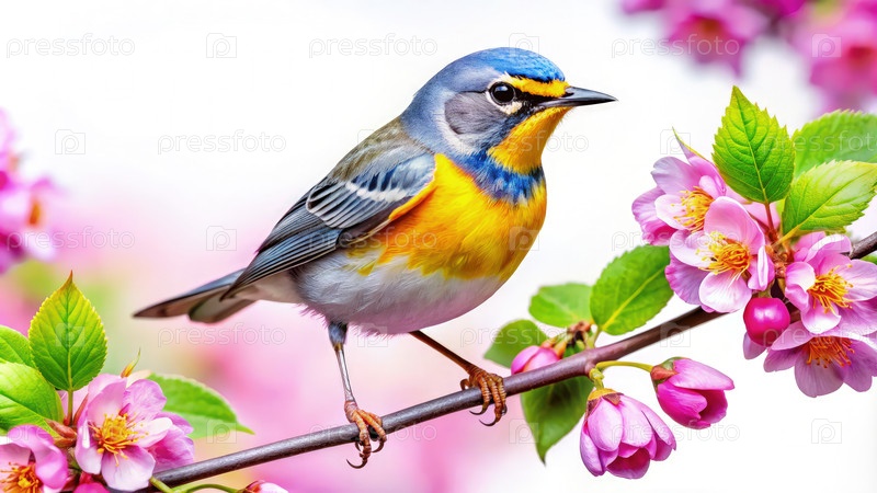 Красочный ворблер сидит на ветке вишневого дерева весной