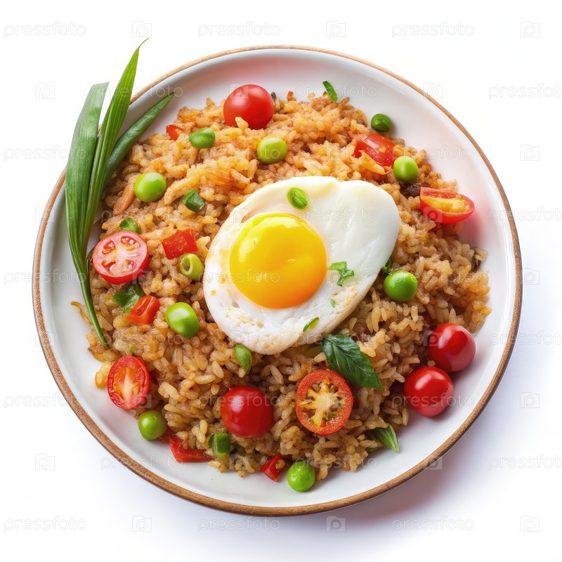 Индонезийский Nasi Goreng с жареным яйцом и овощами на белом фоне