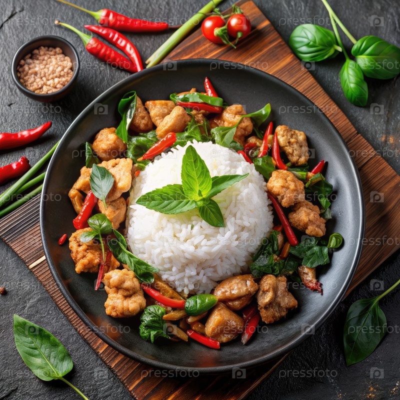 Главное изображение жареного святого базилика с курицей и рисом