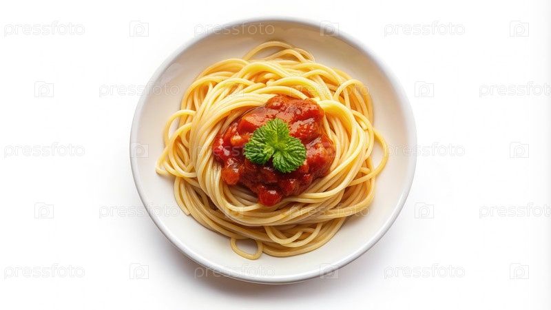 Сверху вниз вид спагетти с пряным соусом на белой тарелке