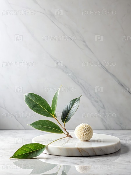 Минималистский натюрморт с зелеными листьями и белым цветом на мраморной платформе