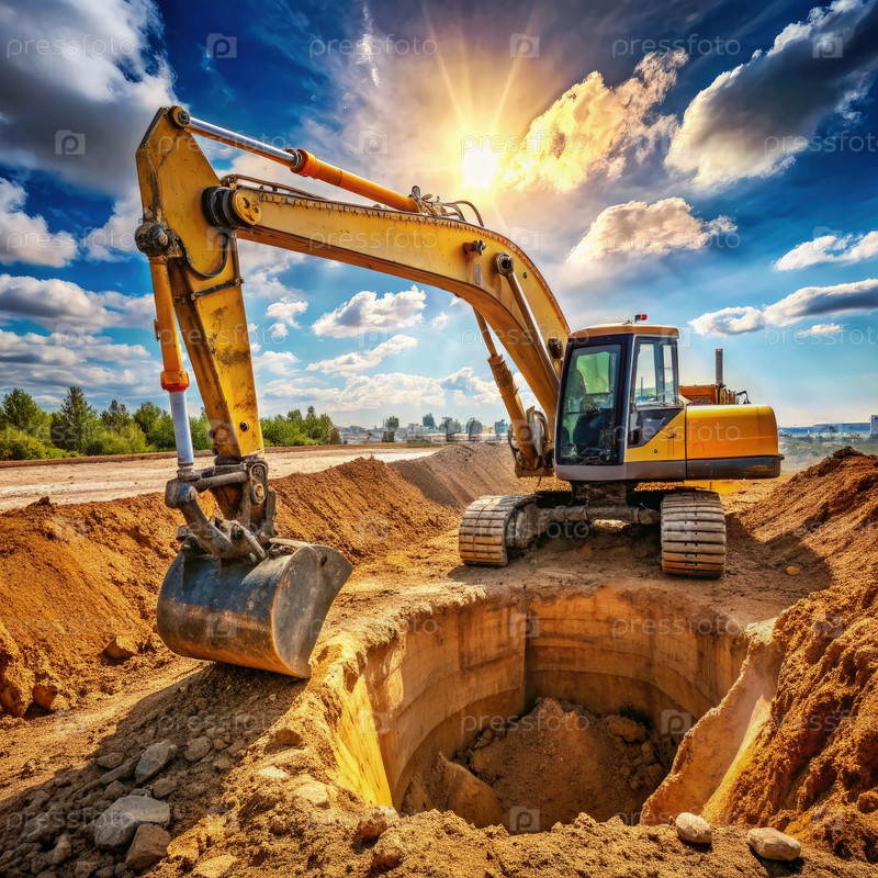 Экскаватор копает яму на стройплощадке под солнечным небом