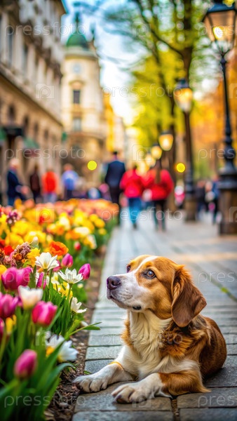 Одинокая собака, лежащая у тюльпанов на оживленной городской улице