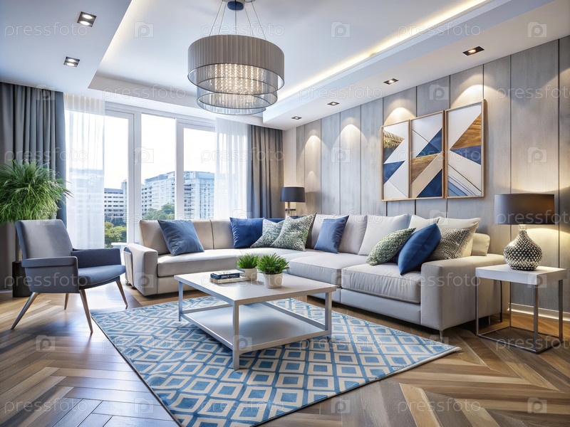 Современная гостиная с белым диваном, синими подушками и геометрическими рисунками