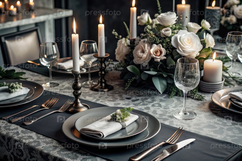 Элегантно установите обеденный стол со свечами и цветами для романтического вечера
