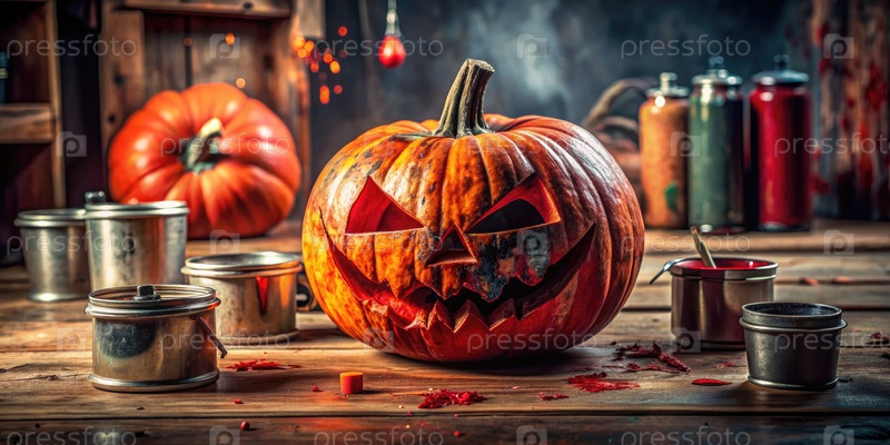 Вырезанная тыква Хэллоуина, покрытая красной краской на деревянном столе