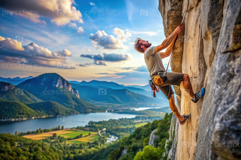 Скалолазка, поднимающаяся по крутой скале с потрясающим видом на горы и озеро при закате солнца
