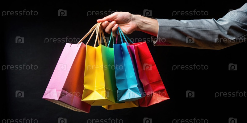 Рука держит красочные сумки для покупок на черном фоне
