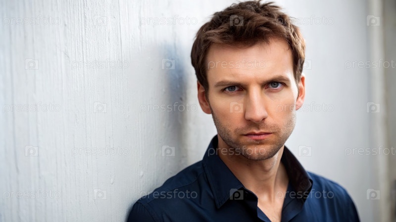 Серьезный мужчина с короткими коричневыми волосами, опирающийся на белую стену